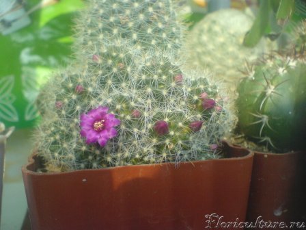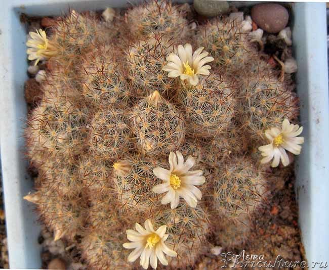 Mammillaria prolofera, наверно, самый распространенный кактус. Немного опушенный, колючки могут быть темно-красными, желтыми или почти белыми. Цветочки малюсенькие - около 1 см, светлые. Цветет обильно. И если куртинка этой маммиллярии разросшаяся, то в период цветения похожа на полянку с ромашками.