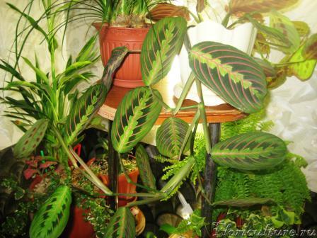 Надеюсь, что на моем фото маранта не слишком "затерялась" среди других цветов. Просто она стоит на полке, поэтому многие другие растения попали в кадр. :D