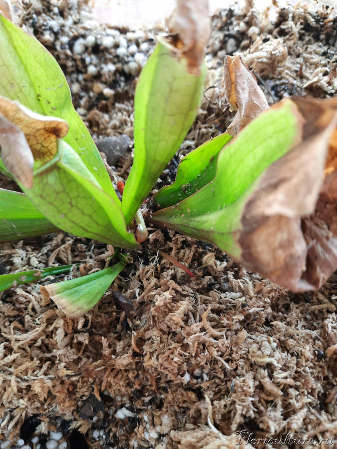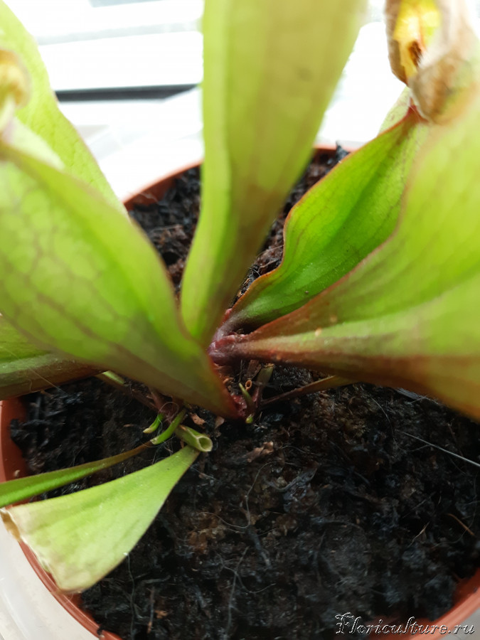 Постоянно вспоминая, что в природных условиях psittacina временами полностью затапливается, прошлой осенью начал опрыскивать её водой. Вскоре саррацения начала сушить капюшоны (возможно, просто совпадение). Глядя на то, как закис с весны грунт у росянок, подумал, что саррацении тоже могло "поплохеть" от этого. Пересадил в ноябре, позже полил янтарной кислотой, но сушка кончиков листьев продолжалась.