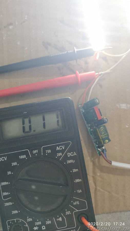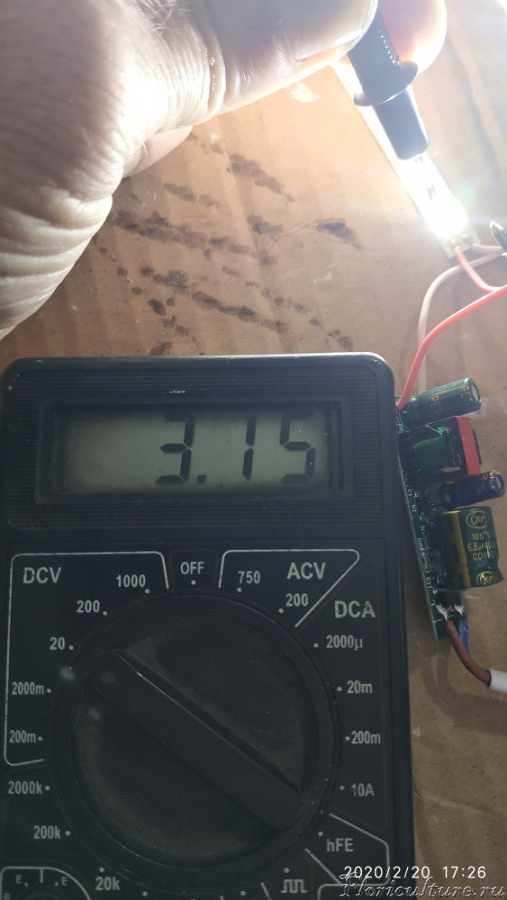 Замерил падение напряжения на диоде, 3,15 V (+ - 1%), взял среднее значение, теперь мы можем посчитать мощность одного Светика ну и соответственно всего светильника.