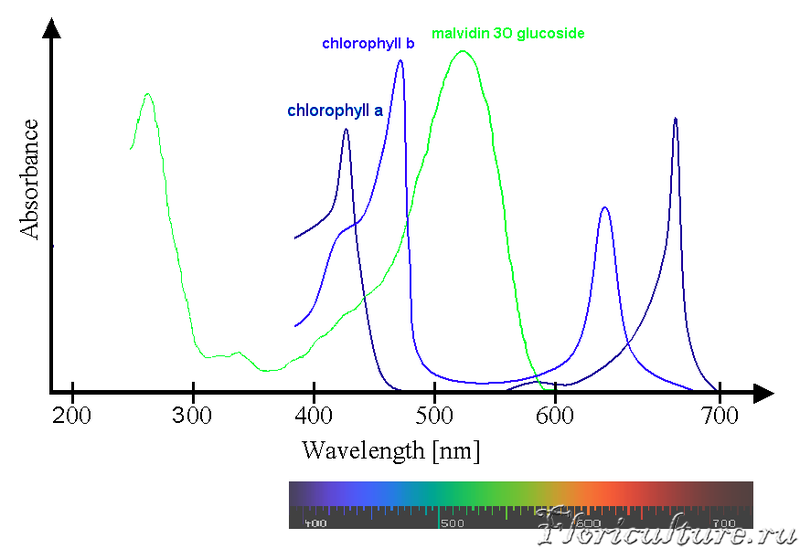 Но мне думается, механизм образования антоцианов (да и вообще физиологии растений) немного сложнее. Это для нас -красное, это красиво. А растение по существу защищается от излишков света. Возможно разная длинна волны с разной интенсивностью влияет на это. Чисто исходя из физики-синий более "жесткий", агрессивный. На него растения будут быстрее реагировать образованием антоциана. Но он же и вызывает торможение продольного роста растений, вызывая уменьшение размера растения, карликовость. Мы всё ещё слишком мало знаем. Даже все известные ранее графики поглощения хлорофилла сейчас пересматриваются. Очень много данных появляются, что и другие спектры в этом участвуют. Не только синий-красный, как считали раньше. Всё больше профессиональных выращивателей переходит на белый свет, как более универсальный.