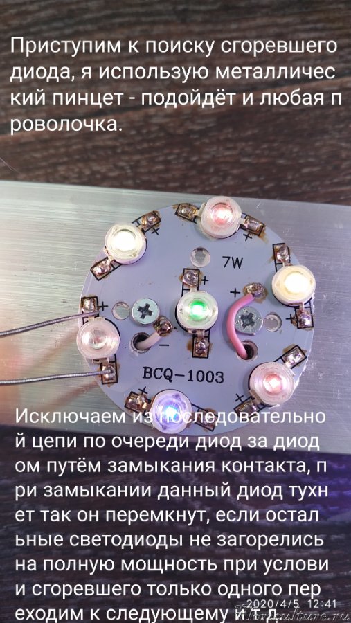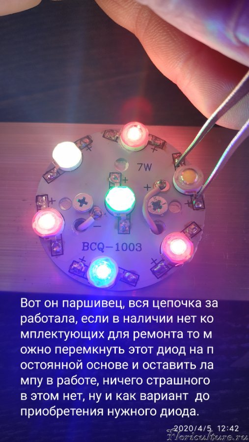 В фул спектре все светодиоды одинаковые так что ничего страшного, попробуете как я покажу чуть позже, если один окажется не рабочим, то обязательно лампа заработает, а там уже примите решение либо так оставить либо по гарантии, если окажется более одного не рабочим то скажу как найти :wink: