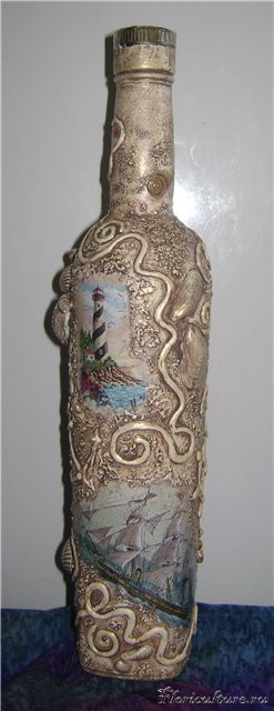 Вот недавно сделала на подарок бутылку с коньячком в морском стиле