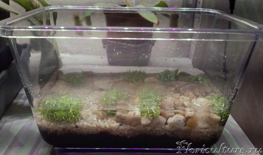 А в начале февраля я был на выставке-продаже всяких штук и живности для террариума, и там увидел вот такую меристемную U. graminifolia. Не удержался, купил. Посадил её в контейнер для хомяка, переоборудованный в мини-палюдариум) На дне слой кислого торфа, сверху крупный кварцевый песок и кварцевая же галька. Вода - дистиллят. Свет - мультибиколор на высоте 50 см. И всё равно там уже сами собой поселились водоросли-обрастатели, а в воде плавают всякие одноклеточные. Ну, посмотрим, кто кого.