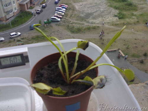Обе мухоловочки поставил в поддончики и налил по пол-сантиметра дистиллированной воды. В большой поддон налил обычной воды, положил кусок пенопласта, а на пенопласт поставил мухоловок. Всю эту конструкцию выставил на балкон. Живу я в Киеве, окна выходят на Юго-Запад. Начиная с 12 часов и до 18-ти, а то и дольше на балконе прямое солнце (6 часов тоесть). И солнце это последние несколько дней было ОЧЕНЬ жарким. По показаниям гигрометра влажность была на уровне 20% и это при том, что мухоловки стояли в поддоне с водой.