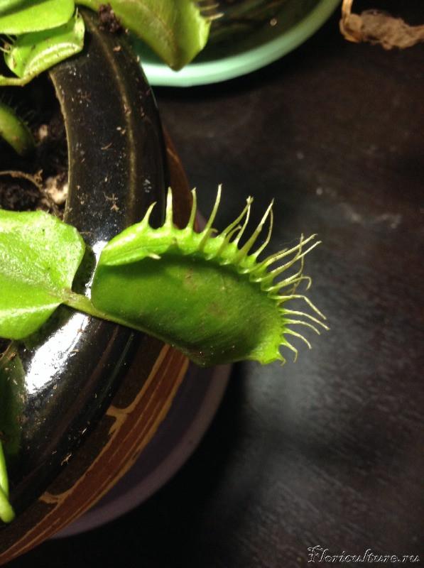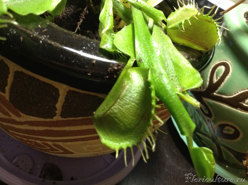 Почти у всех листьев края почерневшие. Дальше эти почерневшие листья становятся как лист слева (8ч) – края полностью чёрные, центральная жила и ловушка – обычные. Такие чёрные листья почему-то ловят мух, сами, и выделяют жидкость для переваривания. Но потом, с мухой или без, чернеют и жила и ловушка.