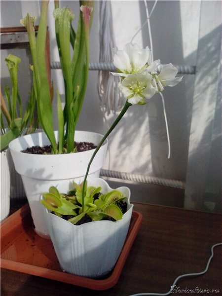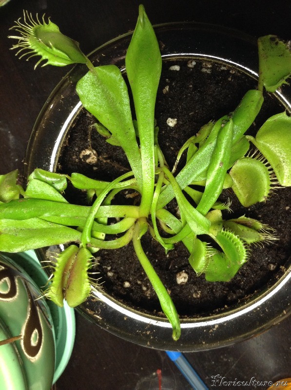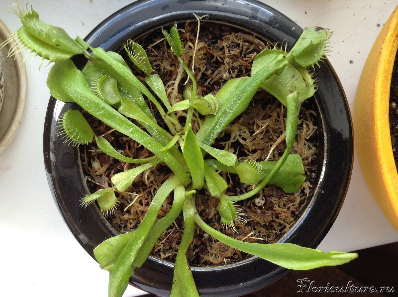 Здравствуйте, любители хищников!) В середине мая я стала обладательницей Дионеи по имени Сан Саныч. Благо, про подходящий субстрат и условия узнала сразу, торф нашелся, вместо перлита взяла песок, т.к. первый не нашла. Окно юго-восточное, полив дистиллировкой. Через неделю старых листьев уже не осталось. Первый новый лист лез широкий, а каждый последующий все уже и уже. Теперь листья совсем тонкие, хотя растение зеленое и само исправно кушает мух, даже не знаю, откуда она их берет)). Пол месяца назад плошку перевернули, листья придавило, в ловушки попала земля. Паника, экстренная пересадка, но ничего, Сан Саныч пережил сию напасть)) Цветоносов не было, розетка одна, маленькая совсем. Вот еще проблема: последнюю неделю погода плохая, солнца нет совсем, света мало, а в доме тепло. Отсюда вопрос: уже начинать снижать температуру к зимовке или рано еще? Просто с балконом пока проблемы, а переносить в другое здание не хочется, там ремонт, как бы ее там никто не убил. Спасибо, буду рада любым советам))
