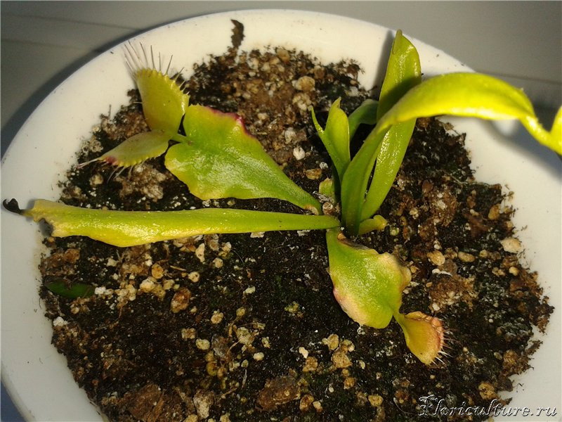 Прошел месяц после покупки в магазине. У одной магазинной ловушки( на фото слева) покраснели три реснички и краешек листа, хотя уже примерно дней 10 это покраснение дальше не распространяется. Другие магазинные листья сохнут. Выпустила у меня одновременно 2 листа - один (на фото вертикальный) внешне абсолютно нормальный, ловушка уже открылась. А вот у другого(на фото слева) почернел кончик, и ловушка там не выросла. .Совсем новые листья вроде пока нормально растут. В принципе на долгую жизнь магазинных листьев я и не рассчитывал, но меня смущает новый лист с черным как уголь концом. С чем это может быть связано? И что с ним делать?