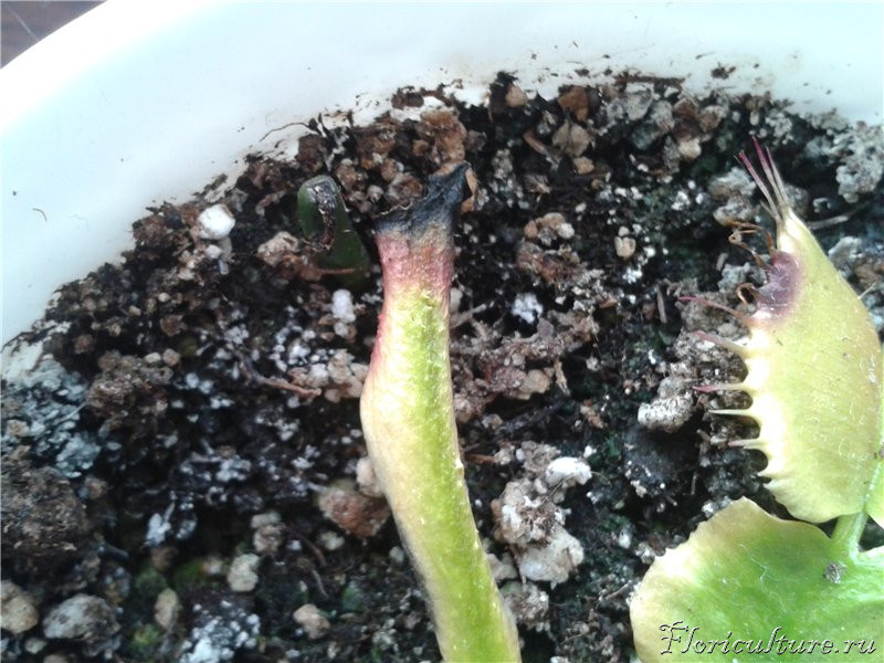 Понятия не имею, что с ней. Жена, опираясь на свой опыт выращивания нехищных растений, уверена, что мухоловку мы "залили".