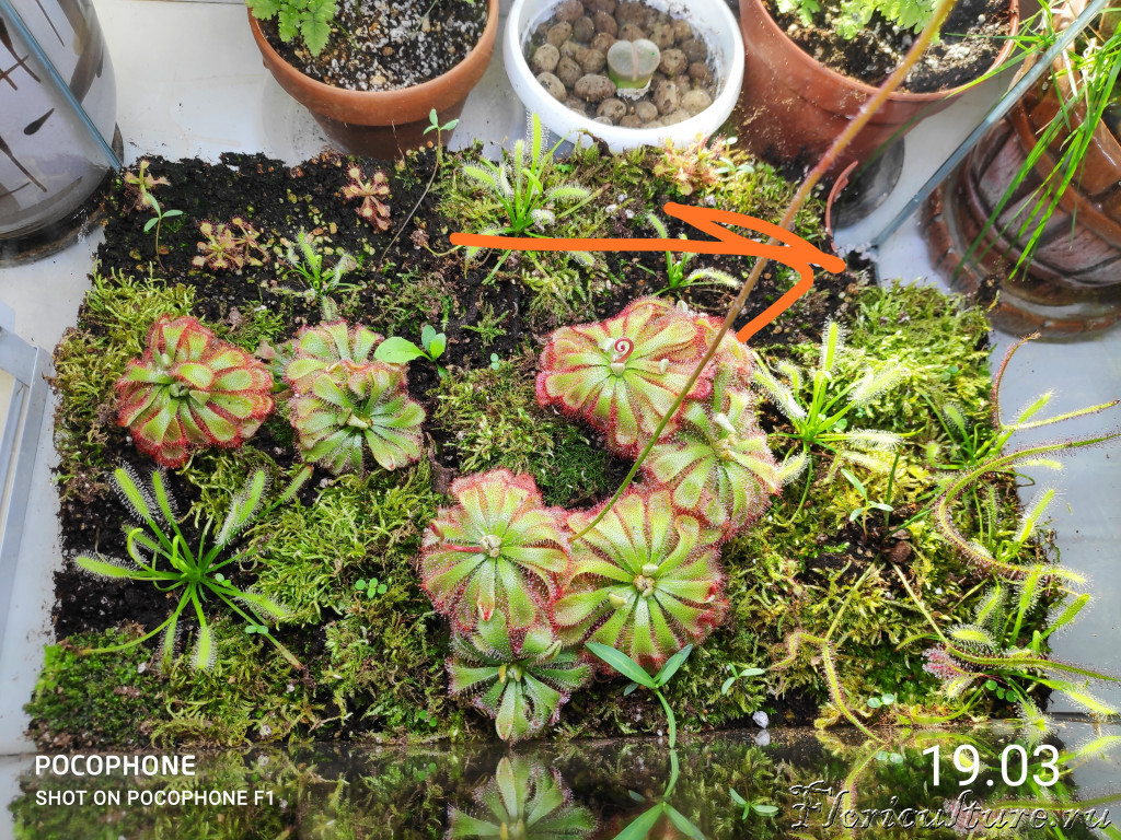 JulietKa, Добрый день! Прошло много времени, но все равно отвечу) Там на фото не видно, но в дальнем правом углу стоит пустой траспортировочный горшок пластиковый, вкопанный в торф, вот в него воду и лью, получается что полив нижний) На фото указано стрелкой. Плюс для хорошего самочувствия важен свет, там лампа хорошая Акваэль дуо, с двумя рядами светодиодов. Она им сильно нравится, даже росянка белая и то чуток розовая стала)