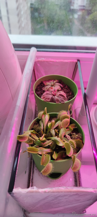 Fluffy, с моей точки зрения растениям темно, они бледные, на росянках мало росы и мухоловка вытянутая, на западном окне нужно 12 часов минимум досветки круглый год и хорошо бы солнце часа 3 хоть, лампа нужна специальная 8000К, совершенно не обязательно розовая. Расположение над растениями, а не сбоку, но не так близко, как у вас, хоть на 10 см повыше.