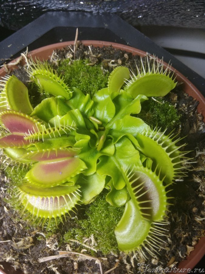 На фотографиях сорта есть растения как с волнистыми листьями, так и с ровными. Поэтому 100% не дам, но очень похож.it produces decumbent leaves throughout the growing season that bear robust traps that are up to 5 cm long. It rivals Dionaea ' B52 ' B.Rice and Dionaea ' DC XL ' S.Doonan & M.Miller for the title of cultivar that produces the biggest traps (but not biggest overall leaf size). Rosettes of leaves of this cultivar can reach 20 cm in diameter, and it divides frequently to produce impressive clumps of growth. The interior surfaces of the traps are bright red, while the lobe margins and all other parts are yellowish green.