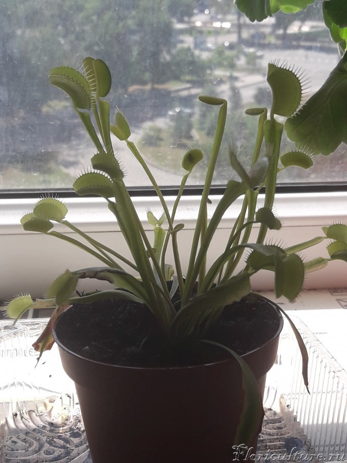 Всем привет! Осенью купила замученную Венерину Мухоловку. Сразу пересадила в правильный кислый торф с вымоченным в дистиллированной воде перлитом. Стояла под лампой, на зимовку не отправляла. Она потихоньку нарастила новые ловушки. Хочу спросить у опытных хищниководов, хватает ли ей света? Ловушки зеленые растут вверх, а раньше росли короткие ближе к земле. Может вытягивается от недостатка света? Сейчас я ее притеняю, стоит на кухонном окне. У нас 6 этаж, если не притенять там настоящее адское пекло. Прочитала, что она хорошо переносит прямое солнце, но мухоловка обожгла листья. Золотисто-коричневый ожог явно после солнышка был. Если вопрос уже был такой простите, я новичек)