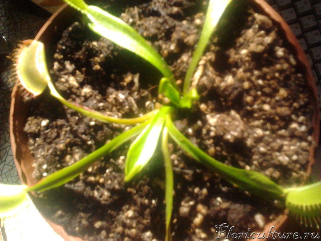 Пишу снова: мухоловка куплена 8го марта, пересажена 9го. К сожалению в неправильный торф( копали сами)+перлит вымоченный.Окно западное, полив дисс водой с поддона, условия спартанские (печное отопление) Растюха активно наращивала листья и ловушки а я радовалась.