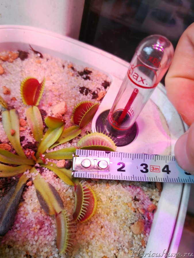 И первый же номер - самый красный из маленьких и самый маленький из красных - 1,8 см. Номер 2 - честные 2,5 см на двух ловушках. При этом ловушки крупнее, хотя и немного менее красные. Интересная разница, ведь они раньше были одним растением, просто с разными точками роста.