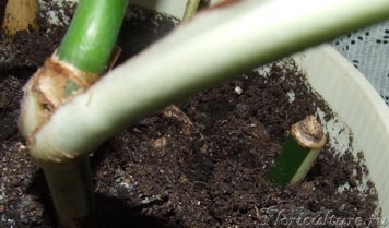 Зато я тут кое-что предприняла. Оставался "полосатый" кусочек стволика примерно 6 см, из которого уже отходил корень. Так я этот стволик аккуратно отделила от основного цветка и посадила рядышком, чтобы корни не обломать. Не знаю, даст ли это результат. Операцию провела месяц назад. Пока и само материнское растение живо, даже листочки дает, и стволик маленький сидит, пока без отросточков, но живой. Есть, наверное, надежда???