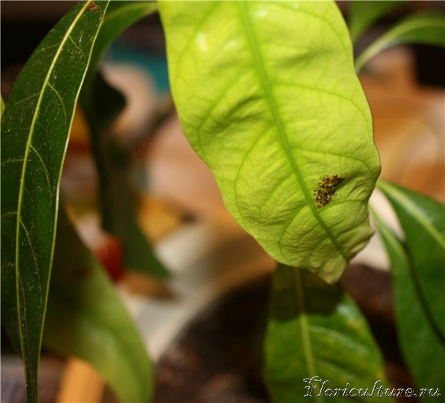 Девочки, с моим манго это уже давно, но ума не приложу, что именно у него. Летом с листиками все нормально. А зимой, как выпускает новый молоденький лист, то на нем какие то почернения, на верхней стороне листа. Причем они не прощупываются, и на растении это вообще никак не отражается, ну если только лишь само растение теряет свою привлекательность. Подскажите, может ему какого витамина не хватает, а?