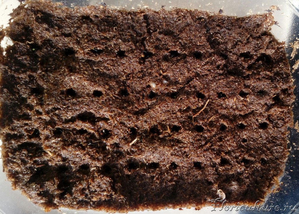 Семена положены в небольшие лунки, т.е. с одной стороны за счет испарения воды с поверхности и в этих самых лунках поддерживается высокая влажность способствующая прорастанию семян, а с другой стороны открытая система не дает воздуху застаиваться. В качестве грунта - торф ( кислотность честно не проверял,но на этикетке пишут 3.5 -4, в принципе доверяю, потому что куплен был в совхозе декоративного садоводства). Причем верхний слой из просеянного торфа для лучшей смачиваемости.