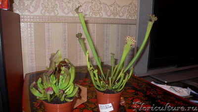 Подскажите, как называются эти Саррацении, а то на горшках нет никаких названий. Если я правильно понимаю, то Саррацении сейчас тоже "спят", тогда что делать с мухами, которые попались и можно ли добавлять воду в кувшинки.