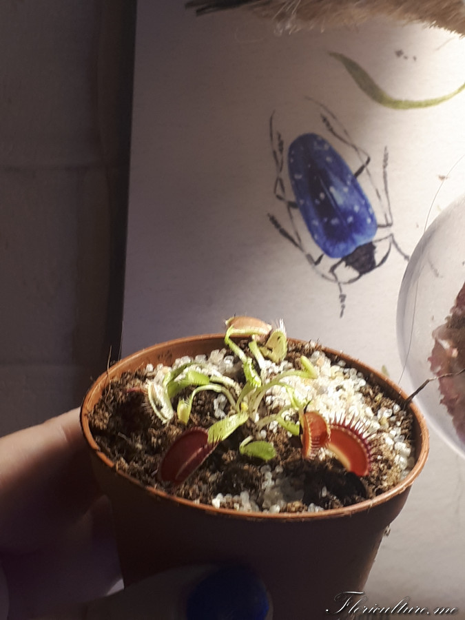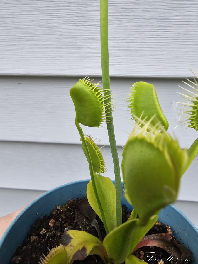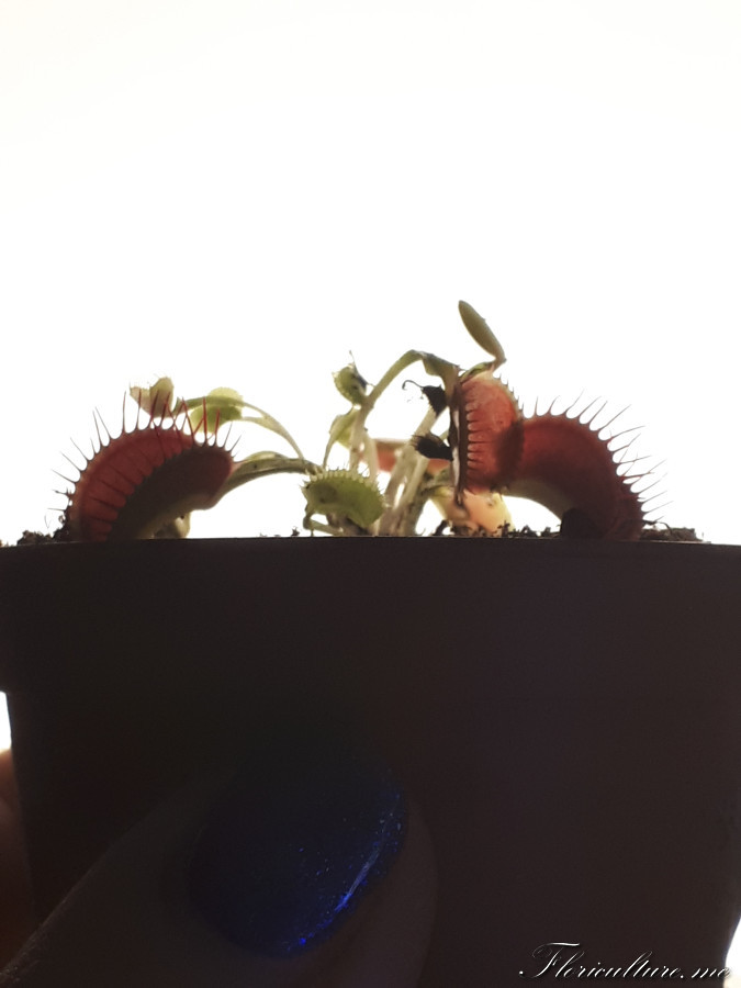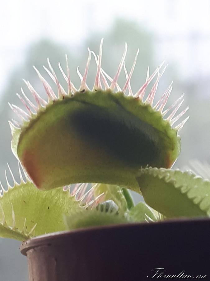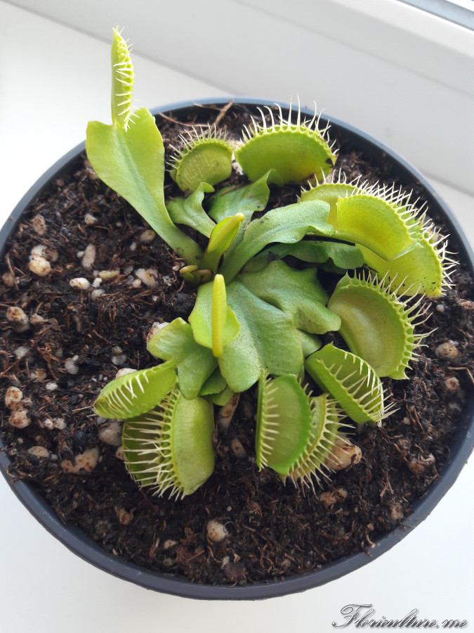 В первую неделю она отрастила 3 новых листика и цветонос. Цветонос я срезала, когда он дорос до ок.5 см. Сейчас уже почти месяц как у меня, и теперь листья стали приобретать желтоватый оттенок, и новые листики растут уже с желтизной. Листья упругие, плотные. Ловушки стали открываться уже розовенькими.