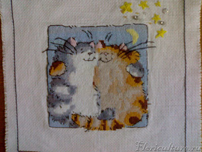 Снежные барсы. Размер 20х25см. Вышивала около 1,5 месяцев. Испорчена тем, что разметку производила простым карандашом