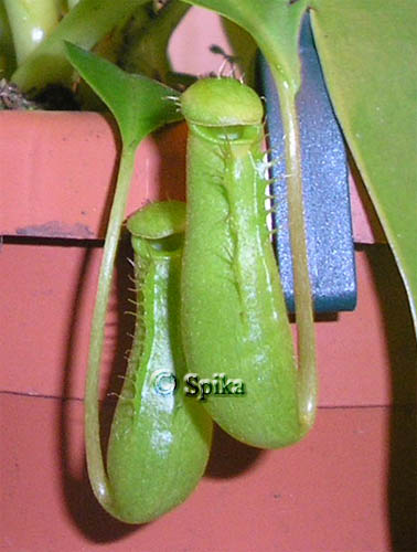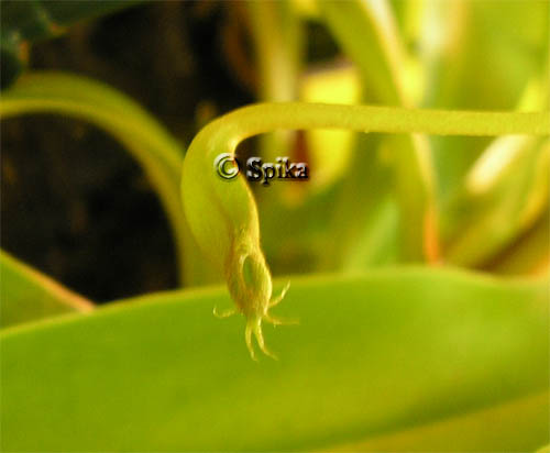 5.08.06г.- Купили непентес с 12-ю кувшинами. По приходу домой повесили на застекленный балкон и бросили муху в жидкость на дне кувшинчика. Муха как-то смогла из нее выбраться и ползла по стенке вверх. Была скинута назад.