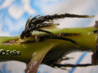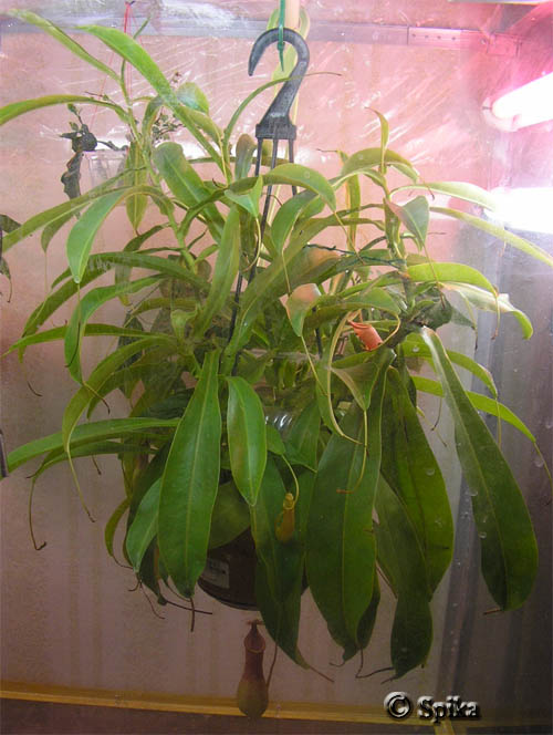 6.08.06г. - Вытащили непентес из горшка, обнаружив, что земля правильная и пересадка ему не требуется, запихнули назад. Муха плавала без движений. 7.08.06г. - Было обнаружено, что поломались 2 крышечки (видимо при попытке пересадки), которые засыхали. Но кроме этого были еще 2 крышки, которые тоже сохли, видимо из-за недостаточной влажности. 8.08.06г. - Были написаны письма зарубежным товарищам, которые занимались выращиванием непентесов, с просьбой дать рекомендации о правильном содержании. Был куплен увлажнитель воздуха и гигрометр, притащен обогреватель из гаража. Поздним вечером на балконе влажность воздуха была всего 50% и +20° C. Пустив в дело притащенное хозяйство, мы засели на кухню с коньяком. Т.к. долго пришлось настраивать обогреватель и увлажнитель на нужные режимы, спать мы отправились только в 6 утра. Вот что бывает, когда приобретаешь растение, для которого у тебя нет подходящих условий. P.S. Ответа не получили:-( 9.08.06г. - Решив, что отапливать и увлажнять неутепленный балкон не имеет смысла, я соорудила минипарничок на "одну персону". В нем контролировать температуру и влажность было легче, чем на всем балконе, где через цели все выдувает. 13.08.06г. - Срезали 2 наполовину засохших кувшинчика. 27.08.06г. - Был наконец сооружен террариум, в котором был помещен непентес. Тогда же и были обнаружены 2 маленьких кувшинчика непентеса, которые росли очень быстро. 8.09.06г. - Был срезан еще один наполовину сухой кувшинчик. Теперь их осталось 8 штук. 11.09.06г. - У малышей кувшинчиков открылись крышечки :-) Находясь еще в закрытом состоянии, жидкость на 1/3 кувшинчика уже присутствовала внутри. 23.09.06г. - Был срезан еще один засыхающий кувшинчик. Еще один на подходе. Боюсь мы можем потерять их все:-( Маленькие кувшины остановились в росте (не понятно чего ждать дальше). Зимой непентес кувшины в большинстве случаев не образует и у кувшинчиков есть свой срок жизни, только вот какой, установить не удалось. 3.10.06г. - Было срезано еще два полусухих кувшинчика и обнаружен еще один малюсенький , на самой ранней стадии развития. В горшке 2 материнских растения, на которых растут взрослые кувшины и 3-4 дочерних растения, на одном из которых и появились малыши. 21.10.06г. - У одиночного кувшинчика открылась крышечка и размером он больше, чем близняшки-кувшинчики. Самый маленький из близняшек - 3см, другой - 3,5 см, а последний кувшин - 4,5 см и больше не растут, видимо и не вырастут. Близняшки начали уже краснеть, правда крышечки еще не приобрели форму взрослого кувшина. 23.10.06г. - Срезаны последние три кувшина, которые резко пошли сохнуть. Мда... остался красивый куст травы :-\ Но не все так плохо, есть малыши и обнаружился еще один, только недавно начавший расти. Поэтому будем растить новое поколение, которое украсит зеленый кустик красными кувшинами :-) 2.11.06г. - Срезала макушку с одного из кустиков, т.к. она вымахала очень длинной. Поставила в воду со стимулятором роста, держу все в том же террариуме, посмотрим укоренится ли и когда. 30.11.06г. - Отрезанная ветка корней не дает, но и не погибает. На самом непентесе 6 кувшинов, которые еще не приобрели красной окраски. На днях самым жаждущим скормила небольших дождевых червей. А самых жаждущих я определила по соку, который тек по наружным стенкам кувшинчика. Может они вовсе есть и не хотели, но мне они напомнили человека, который с голоду пускает слюни :-) 10.01.07г. - Непент