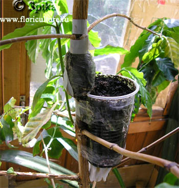 Когда появились корешки в мешочке с землей, встала необходимость увеличивать им жизненное пространство, т.к. макушка большая и корней надо много. Для того, чтобы корни отрасли достаточного размера, я направила их в прозрачный пластиковый стаканчик, где они прекрасно разраслись.